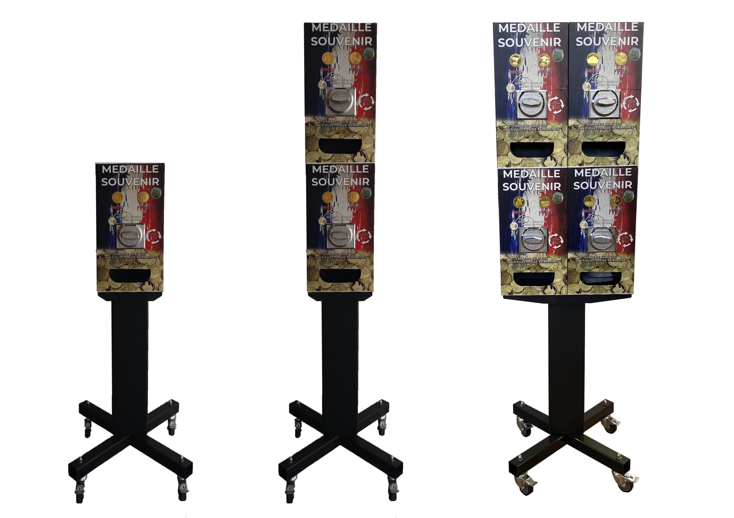 Ofrecemos a nuestros clientes una máquina expendedora mecánica. Altura de 1,50 ml, ligera y fácil de manejar gracias a sus ruedas, sin mantenimiento, fácil de mover y sin electricidad. El frontal se puede personalizar bajo petición (+19 euros sin IVA). Disponible en versiones individual (1 medalla), doble (2 medallas diferentes) o cuádruple (4 medallas diferentes). También disponible en versión eléctrica.